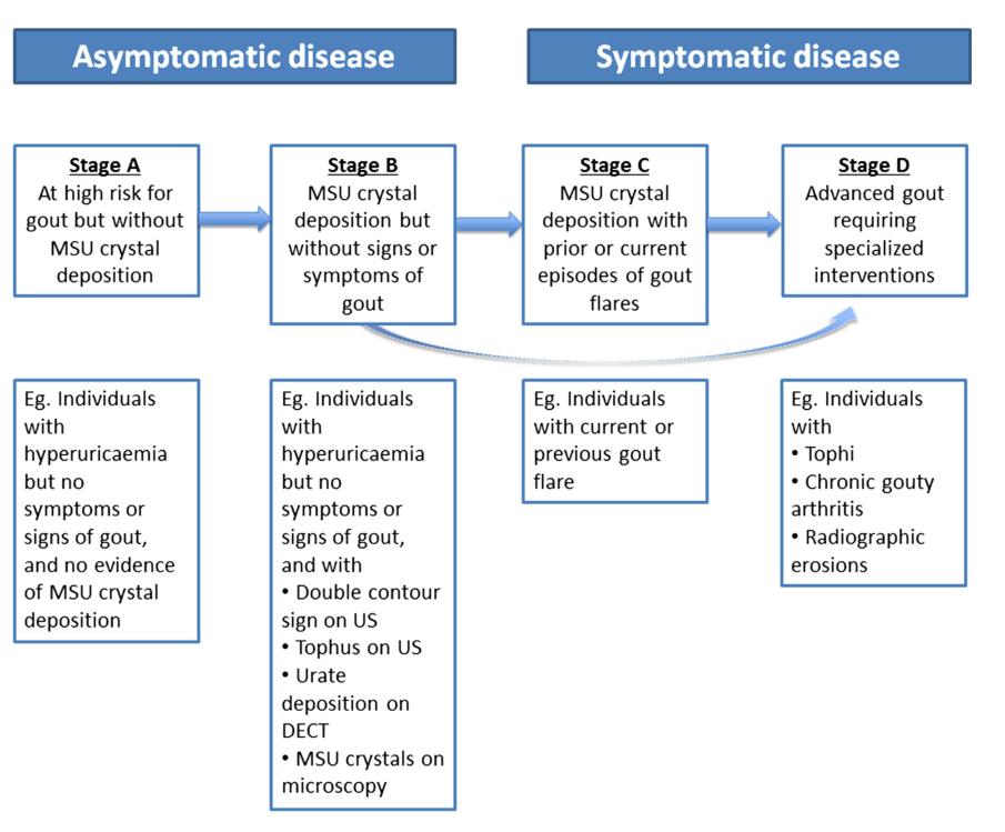 虽然这一分期系统描述了痛风的症状,但它并没有捕捉到疾病病理生理基础的关键方面。影像学成像和显微镜研究表明,单钠尿酸盐(MSU)晶体存在于无症状高尿酸血症患者的关节中,这一部分人群不在传统的分期系统。