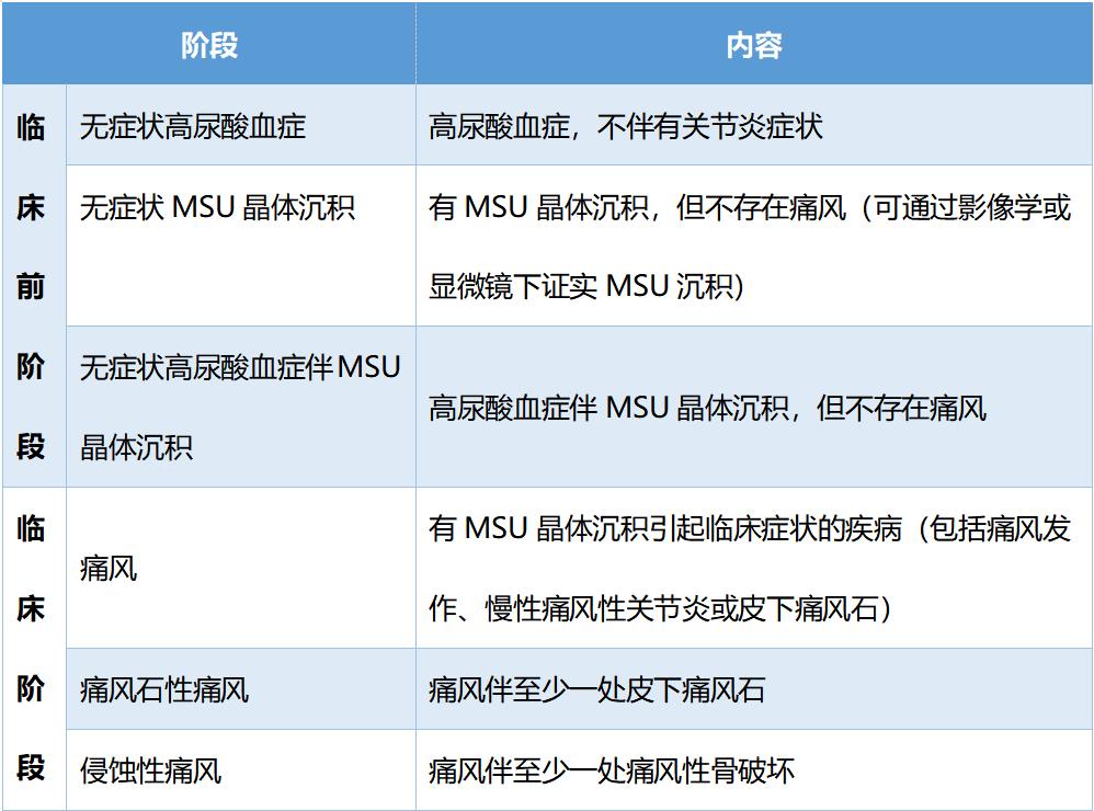 以往高尿酸血症和痛风被认为有四个阶段:无症状高尿酸血症期、急性痛风性关节炎期、临界痛风期及慢性痛风期。