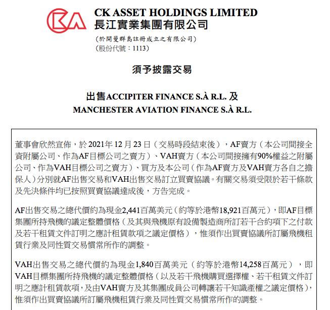 12月24日,长实发布公告称,已于12月23日与全球另类投资机构凯雷集团旗下的航空业及相关航空资产的投资平台Maverick Aviation Partnership LP(“Maverick”)达成协议,以总价42.81亿美元(约331.79亿港元)出售旗下两家飞机租赁公司。Maverick的主要投资者为加拿大养老基金。