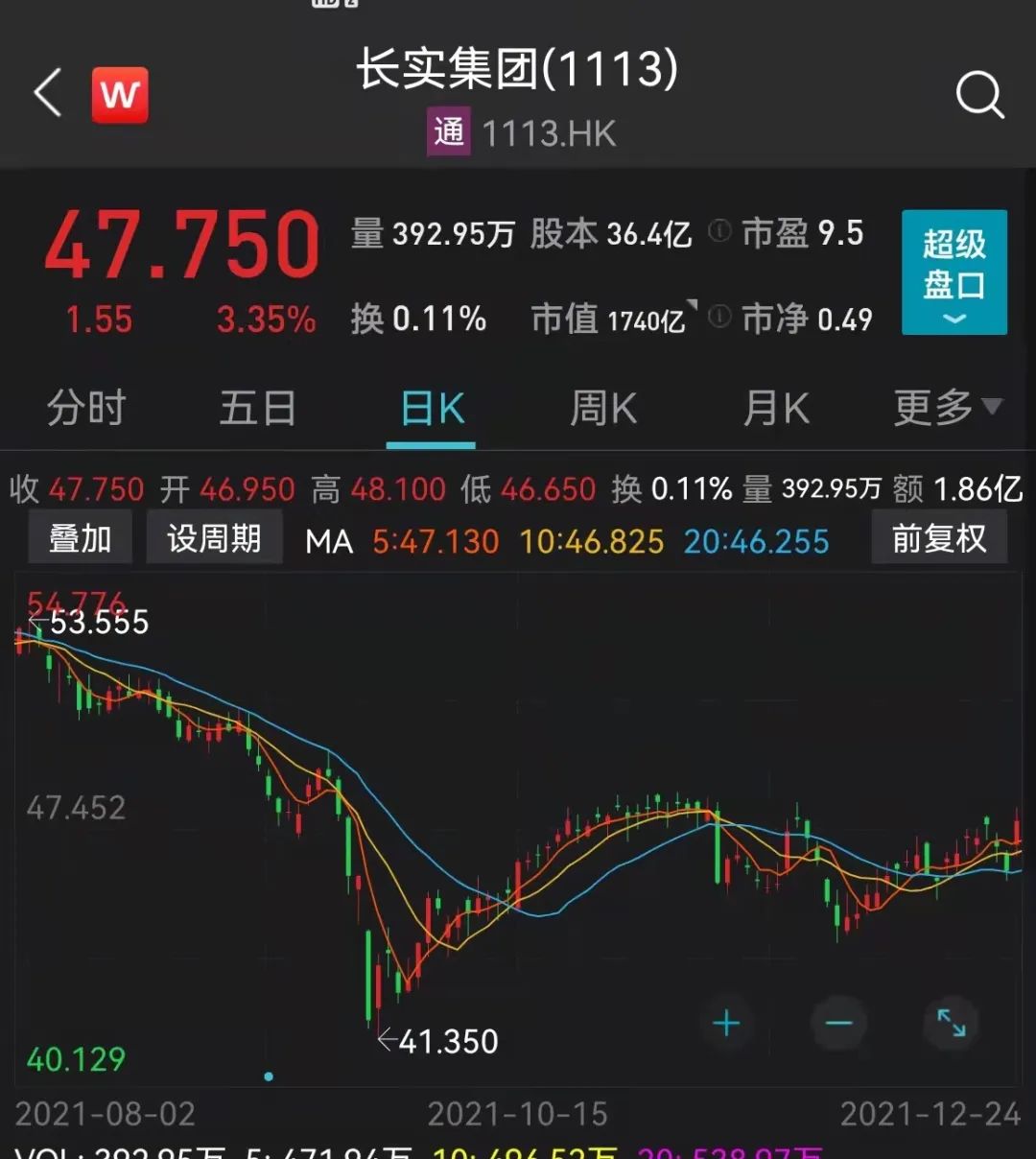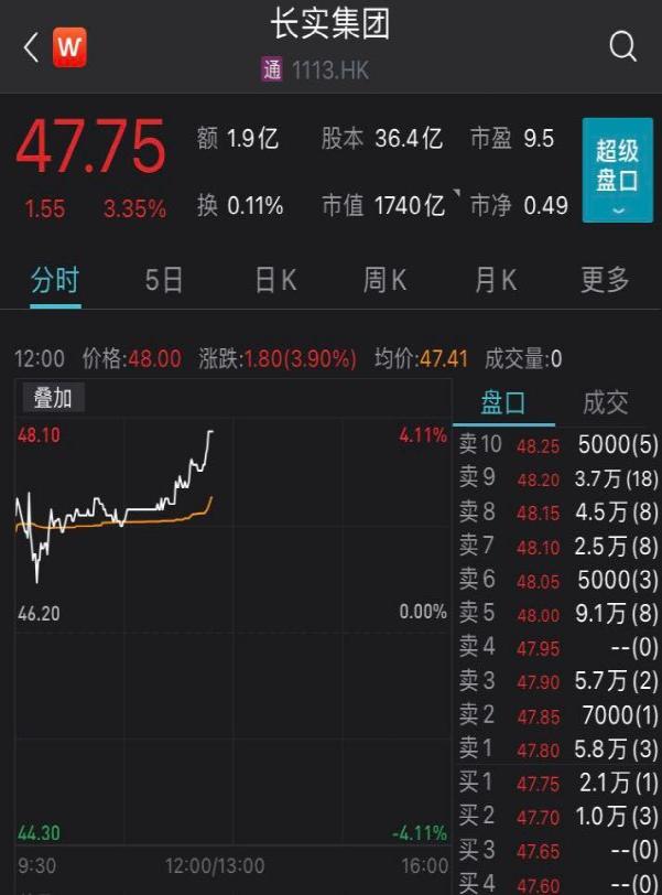 市场对于出售交易的反映积极,长实股价上涨3.35%,收报47.75港元,为12月以来的最高点。