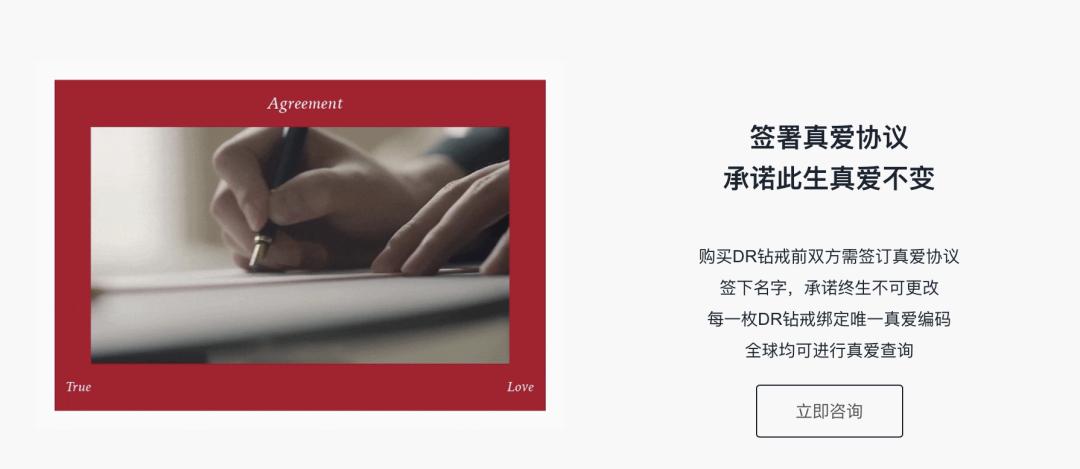 而消费者购买DR产品,都需要满足“一生只送一人”的条件。如购买求婚钻戒时,需要男士绑定有效身份信息并进行验证后才能购买;顾客还需要签署真爱协议并绑定受赠人的姓名,不支持重复购买。