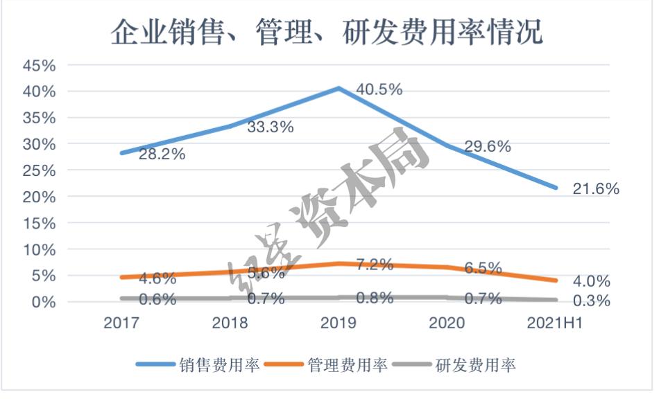 招股书显示,2018~2020年及2021年上半年,迪阿股份的销售费用分别为5.00亿元、6.74亿元、7.29亿元、5.02亿元;销售费用率分别为33.32%、40.51%、29.58%、21.6%。
