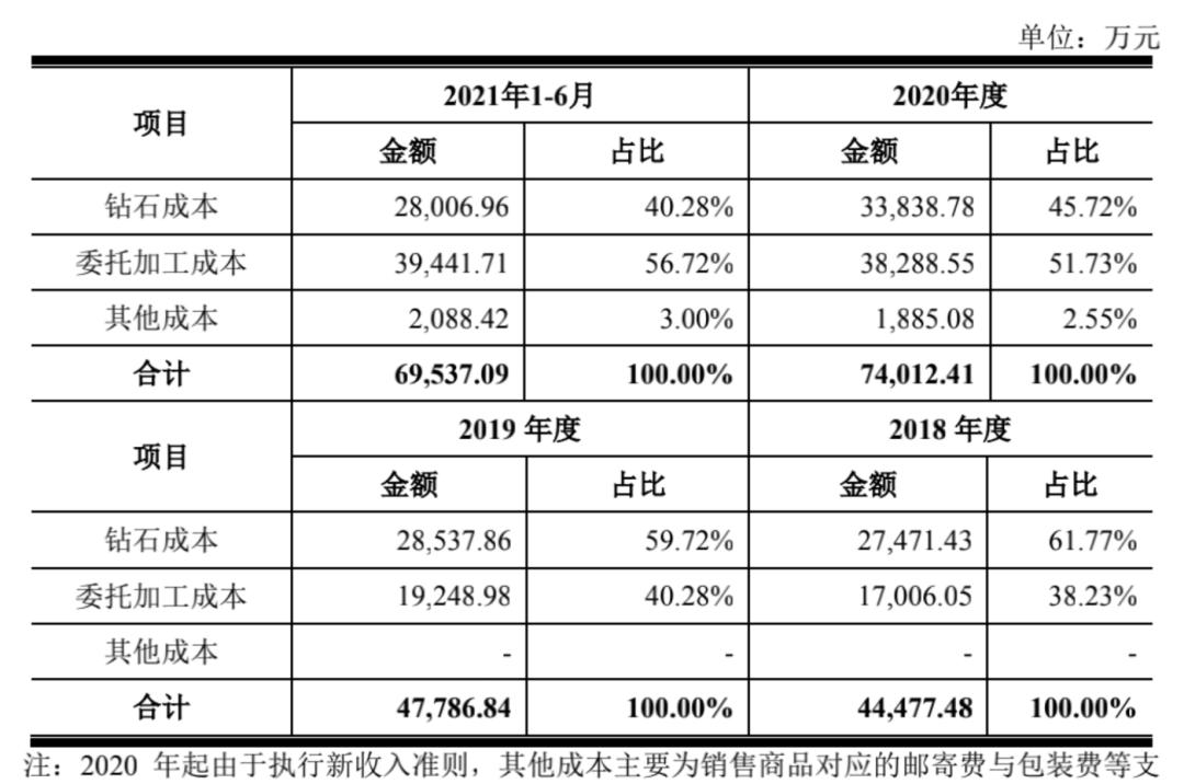 招股书显示,2021年上半年,迪阿股份的钻石成本占比为40.28%,委托加工成本为56.72%,其他成本为3%。