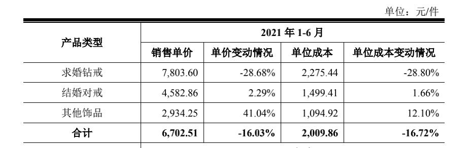 同样是2021年上半年, DR求婚钻戒的单位成本为2275.44元/件,销售单价为7803.60元/件;结婚对戒的单位成本更低,为1499.41元/件,销售单价则为4582.86元/件。