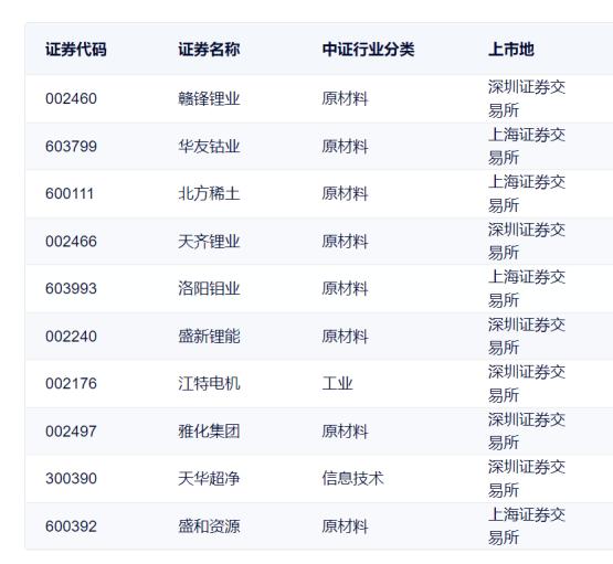 有意思的是,跌幅最大的两只ETF是稀有金属ETF和稀有金属ETF基金,这两只ETF的跌幅分别为4.73%和4.62%。这两只ETF跟踪的是稀有金属指数,该指数的前十大重仓股是赣锋锂业、华友钴业、北方稀土、天齐锂业、洛阳钼业、盛新锂能、江特电机、雅化集团、天华超净和盛和资源。