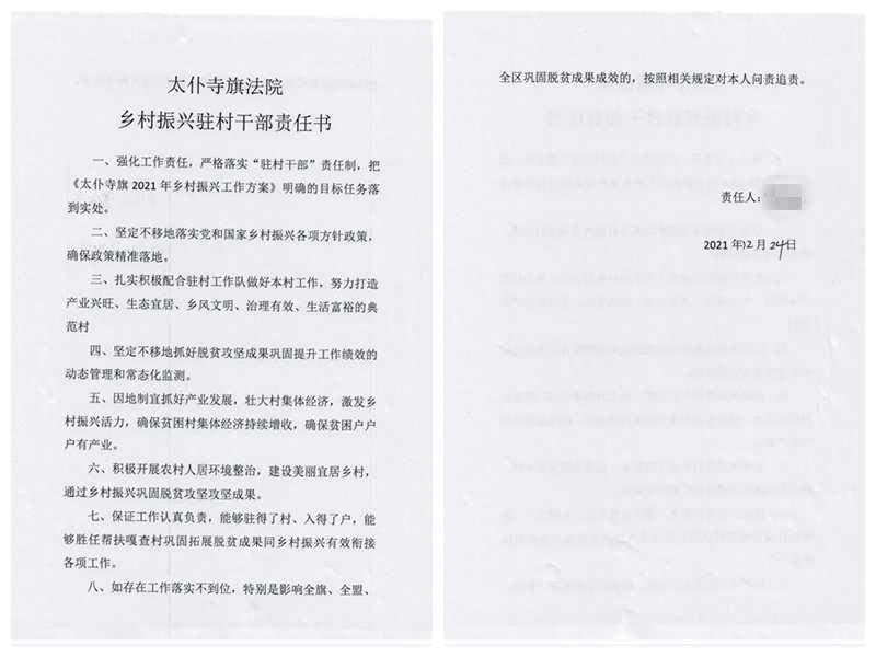 聚焦乡村振兴驻村工作队职责,进一步明确工作队职责任务、日常管理、督导问责等要求,严格驻村管理,院党组与驻村干部签订《太仆寺旗人民法院乡村振兴驻村干部责任书》,明确目标工作任务,强化责任追究。同时严格落实驻村干部吃住在村、请销假制度,督促驻村工作队员严格执行考勤制度,按时到岗到位,严禁出现“走读式”“突击式”现象。