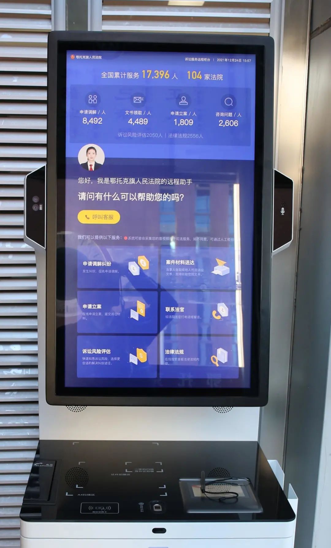 近日,鄂托克旗人民法院正式启用诉讼服务远程柜台。一键呼叫,真人在线指导,当事人只需携带本人身份证即可远程与客服端服务人员高清视频沟通,在线办理包括申请纠纷调解、案件文书领取、法律法规查询、诉讼风险评估、案例查询等相关诉讼服务及咨询。