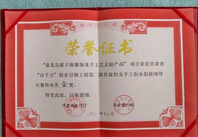 原标题:《【喜报】肃北县蒙古族服饰及手工艺文创产品荣获第二届甘肃妇女手工创业创新网络大赛传承类金奖!》