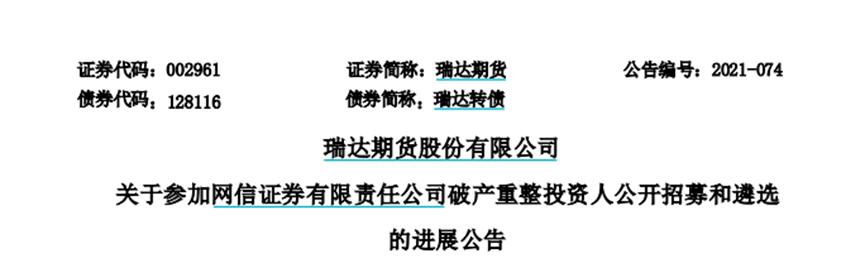 9月下旬,瑞达期货此前曾就参加网信证券破产重整投资人招募发布公告。瑞达期货当时表示,公司致力于成为具有国际竞争力的全能型现代综合金融服务企业,此次参与网信证券破产重整是希望能够有效整合证券公司与期货公司的业务资源,发挥协同效应,满足不同类别客户多元化的需求,为客户提供全方位的风险管理和财富管理等综合金融服务。