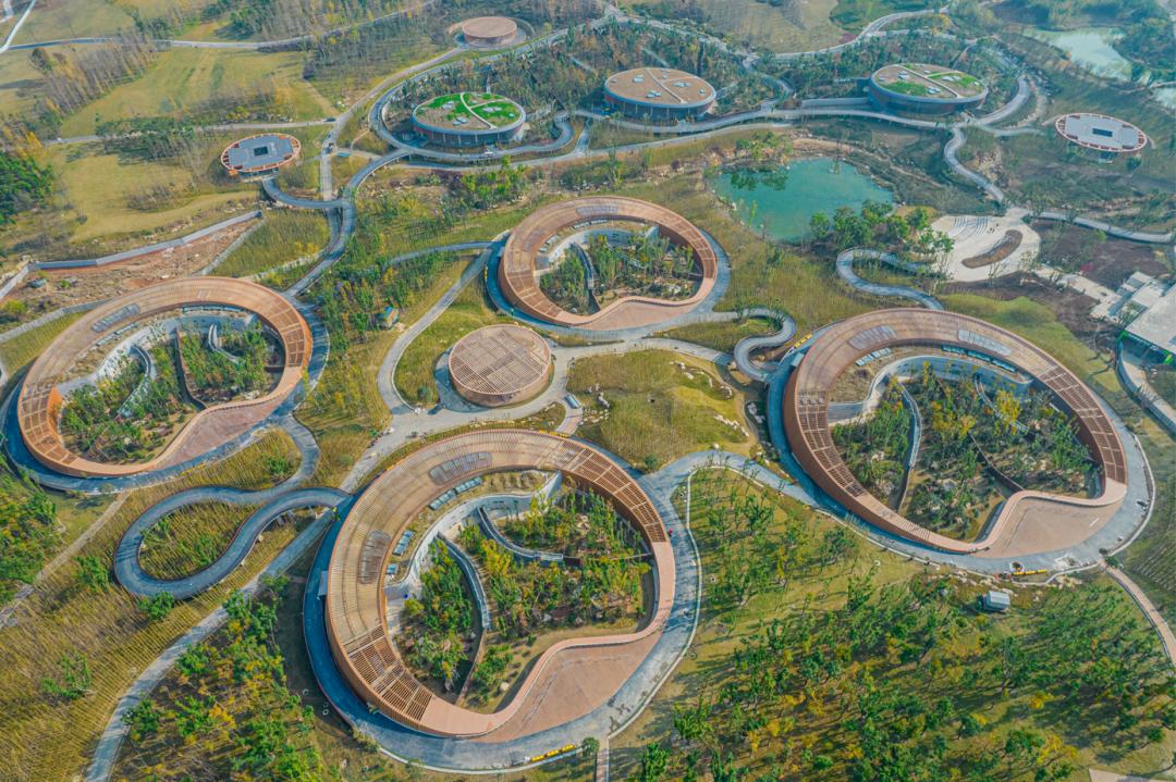 成都熊猫基地扩建区充分遵循并沿用原始地形地貌,利用山体冲沟及溪流形成山地溪谷多层次景观带;根据熊猫主题特点,将项目总体划分为冒险溪谷区、无限山丘区、宝藏湖泊区(熊猫基地老园区)、探索密林区、英雄农场区、科研办公区等区域。