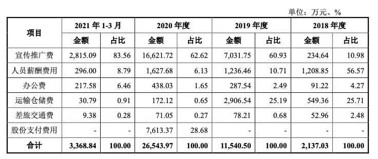 与之形成巨大反差的是大手笔的销售费用。招股书显示,敷尔佳2018-2020年销售费用分别为2137.03万元、1.15亿元及2.65亿元,占各期营收的比例分别为5.72%、8.60%及16.75%。