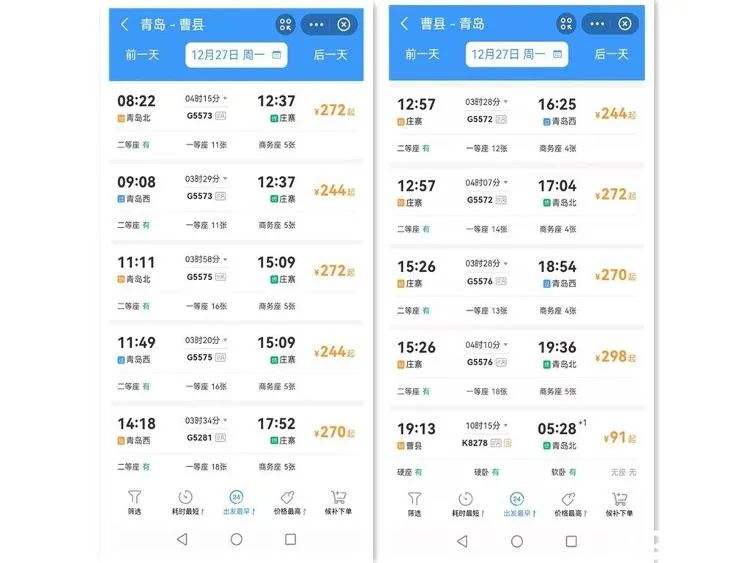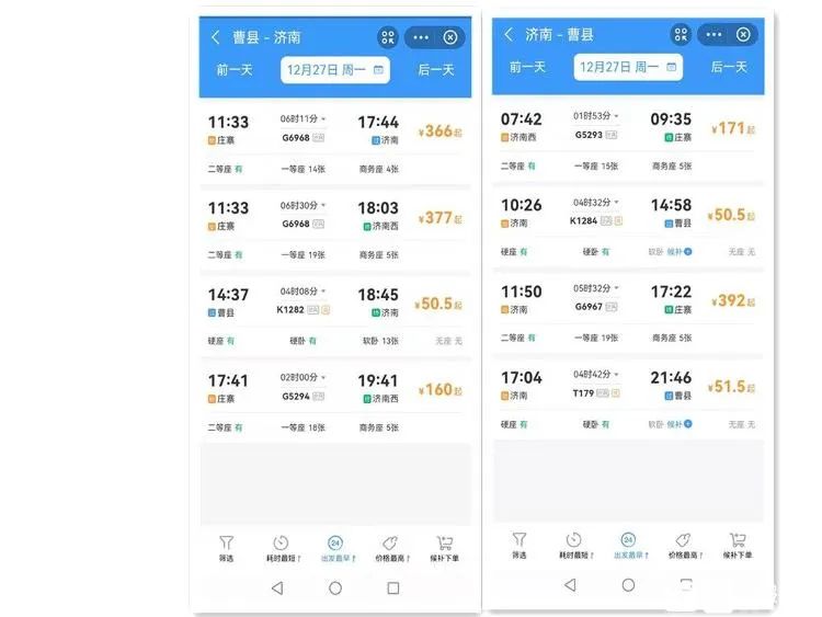 而且,从济南到商丘的高铁票价为209元到225元不等,而济南到曹县的火车票仅需50元。总的来说,虽然钱花的更多了,但是时间并没有节省多少,只是可供选择的火车班次更多了而已。