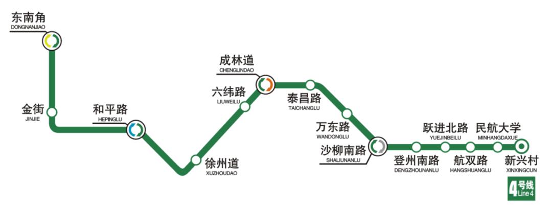 天津地铁4号线南段工程线路北起东南角站,南至东丽区新兴村,沿线经过南开、和平、河西、河东、东丽5个行政区,全长19.4公里,设14座车站,均为地下站,车站自西向东依次为东南角站(与2号线换乘)、金街站、和平路站、徐州道站、六纬路站、成林道站(与5号线换乘)、泰昌路站、万东路站、沙柳南路站(与10号线换乘)、登州南路站、跃进北路站、航双路站、民航大学站、新兴村站。
