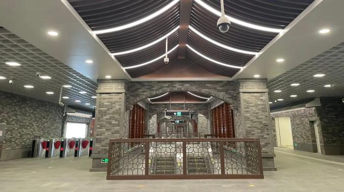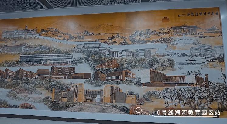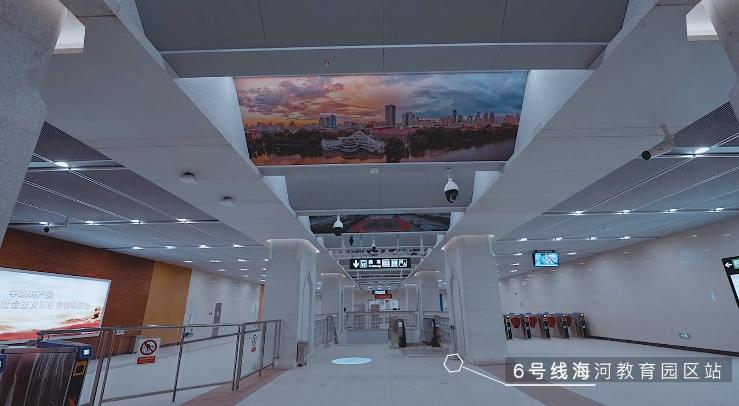 6号线二期以“津门文脉”为线路特色,样板站以古时书院为装修灵感,海河教育园区站提取天津大学北洋亭元素进行了特色装修,体现对津门一脉相承的教育事业的重视。