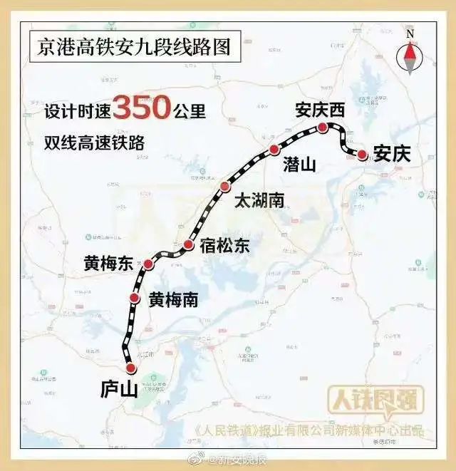 京港高铁安九段起自安徽省安庆西站,终至江西省庐山站,全线设安庆西、潜山、太湖南、宿松东、黄梅东、黄梅南、庐山7座车站,线路全长176公里,设计时速350公里。京港高铁安九段开通运营后,合肥至南昌间实现高铁直通,标志着“八纵八横”高铁网京港(台)通道商丘至深圳段全线贯通。