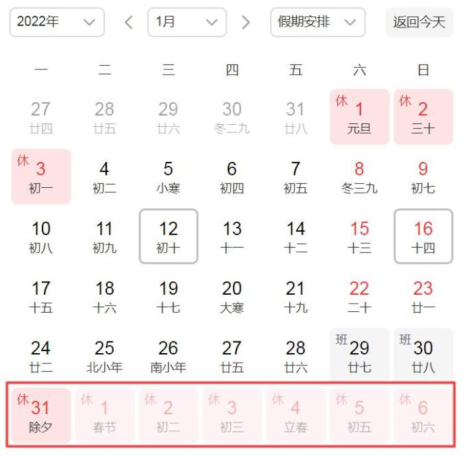 2022年春节放假时间:1月31日至2月6日放假调休共7天1月29日(周六)、1月30日(周日)上班。