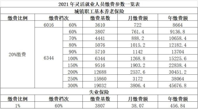 2021年1月1日至12月31日,灵活就业人员自愿参加企业职工基本养老保险,缴费工资基数分为十个档,详情见下表: