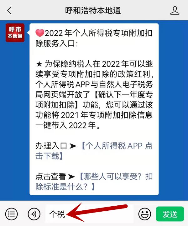 【推荐服务】点击下方“呼和浩特本地通”公众号,在对话框发送“个税”,马上进入2022年个人所得税专项附加扣除服务入口↓↓↓