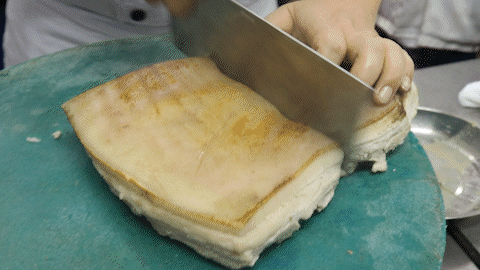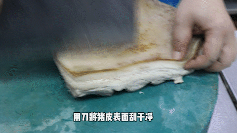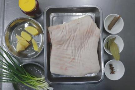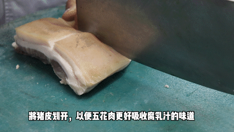7.将猪皮划开,以便五花肉更好吸收腐乳汁的味道