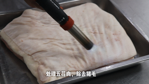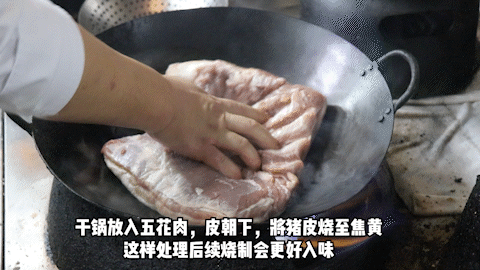 2.干锅放入五花肉,皮朝下,将猪皮烧至焦黄,这样处理后续烧制会更好入味