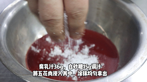 8.腐乳汁36g,白砂糖15g调汁,将五花肉浸入其中,涂抹均匀拿出
