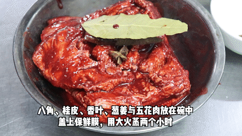 9.将八角、桂皮、香叶、葱姜与五花肉放在碗中,盖上保鲜膜,用大火蒸两个小时