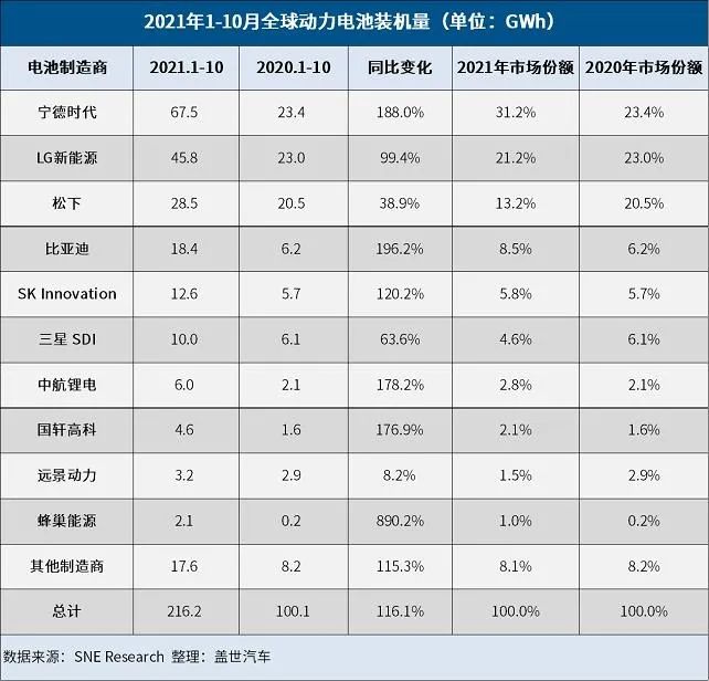 SNE Research公布的数据显示,10月宁德时代以8.9GWh的装机量和34.2%的市场份额独占鳌头,LG新能源以4.8GWh的差额位列第二,比亚迪以172.4%的增速超越松下来到第三,不过从前10月的累计装机量来看,比亚迪与松下的差距依然较大,位列三甲的宁德时代、LG和松下占据了全球65.6%的市场份额,三强争霸格局持续。