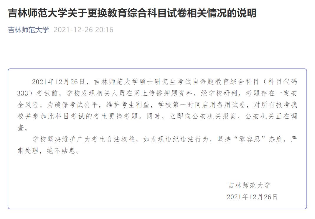 2021年12月26日,吉林师范大学硕士研究生考试自命题教育综合科目(科目代码333)考试前,学校发现相关人员在网上传播押题资料,经学校研判,考题存在一定安全风险。为确保考试公平,维护考生利益,学校第一时间启用备用试卷,对所有报考我校并参加此科目考试的考生更换考题。同时,立即向公安机关报案,公安机关正在调查。