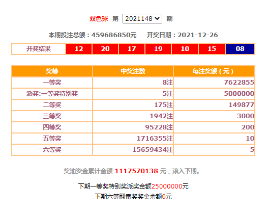 12月26日晚,中国福利彩票双色球游戏进行第2021148期开奖,红球号码为10、12、15、17、19、20,蓝球号码为08。