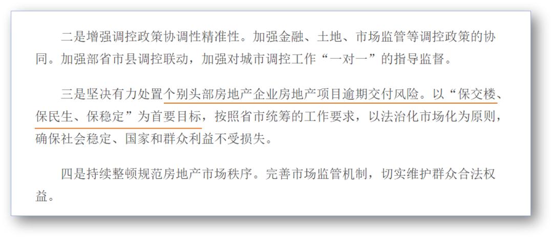 1、坚决有力处置个别头部房企房地产项目逾期交付风险。以“保交楼、保民生、保稳定”为首要目标……确保社会稳定、国家和群众利益不受损失。