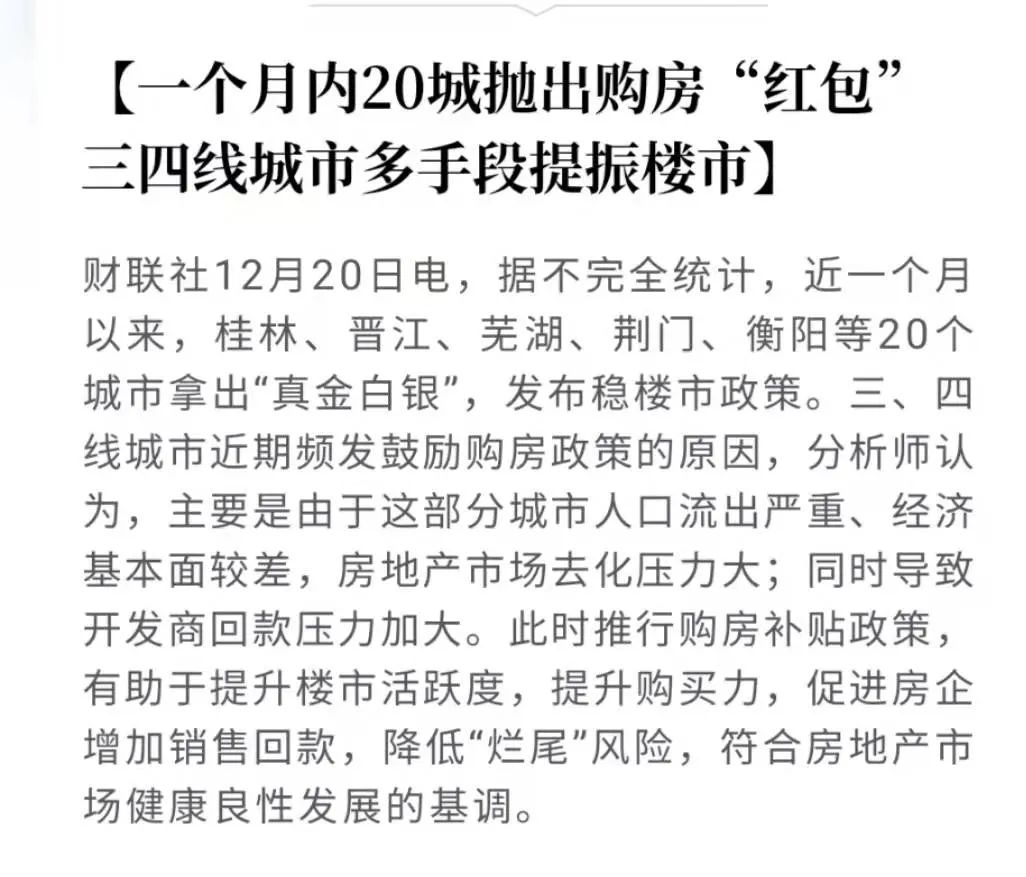 正如《2021年,公开“救市”第一省来了》一文所分析的,据不完全统计,目前已有21城出台“限跌令”,超过20个城市发布买房补贴政策,而黑龙江、吉林两省甚至主动下场托市。