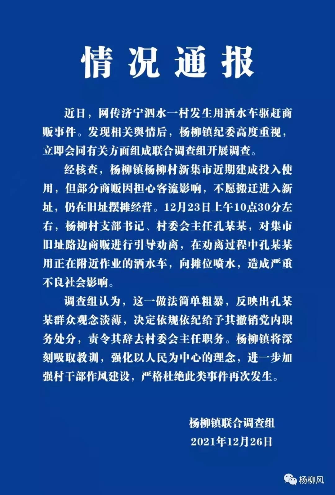 同一天,山东泗水县杨柳镇政府官方微信公众号发布一则情况通报称,近日,网传泗水一村发生用洒水车驱赶商贩事件。发现相关舆情后,杨柳镇纪委高度重视,立即会同有关方面组成联合调查组开展调查。
