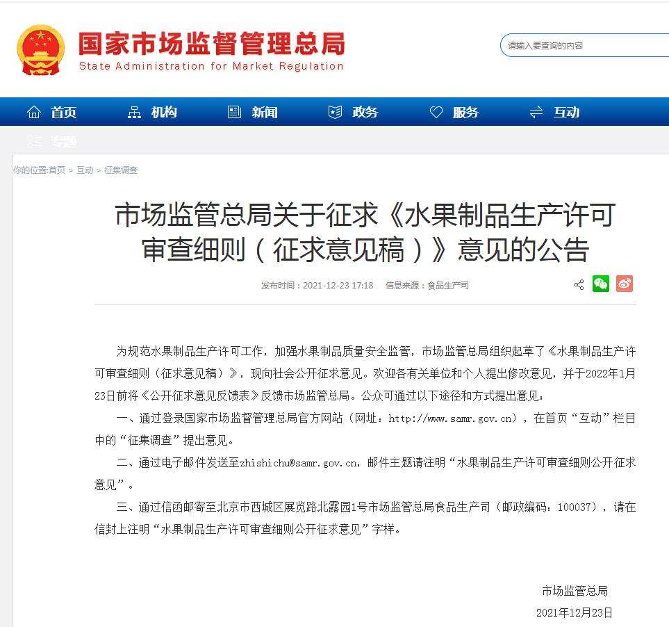 为规范水果制品生产许可工作,加强水果制品质量安全监管,市场监管总局组织起草了《水果制品生产许可审查细则(征求意见稿)》,现向社会公开征求意见。