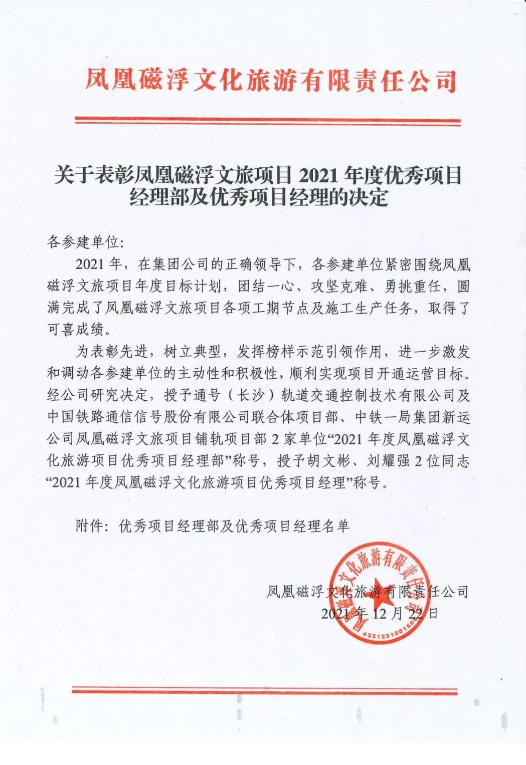 项目全年多次接待各省、市级领导对磁浮项目的考察调研工作,各考察团对中国通号的科技研发实力、项目管控能力及工艺工法水准给予了高度肯定。12月24日,凤凰磁浮项目试运行仪式上,中国通号参建项目部被业主单位授予“优秀项目部”,项目负责人作为突出贡献参建单位代表受邀交流发言。