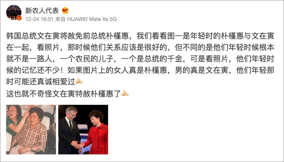 12月24日,有微博用户称:“韩国总统文在寅将赦免前总统朴槿惠,我们看看图一是年轻时的朴槿惠与文在寅在一起,看照片,那时候他们关系应该是很好的,但不同的是他们年轻时候根本就不是一路人,一个农民的儿子,一个是总统的千金,可是看照片,他们年轻时候的记忆还不少!如果图片上的女人真是朴槿惠,男的真是文在寅,他们年轻那时可能还真诚相爱过。这也就不奇怪文在寅特赦朴槿惠了。”