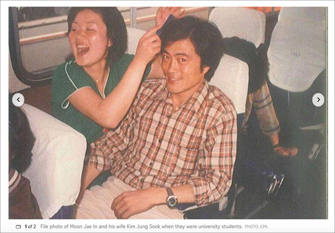 新加坡《海峡时报》2017年5月10日发布的一篇文章中也使用了这张照片,图片说明是文在寅和他的夫人金正淑在大学时代。