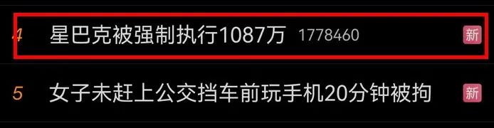 12月27日,#星巴克被强制执行1087万#的话题登上微博热搜第四。