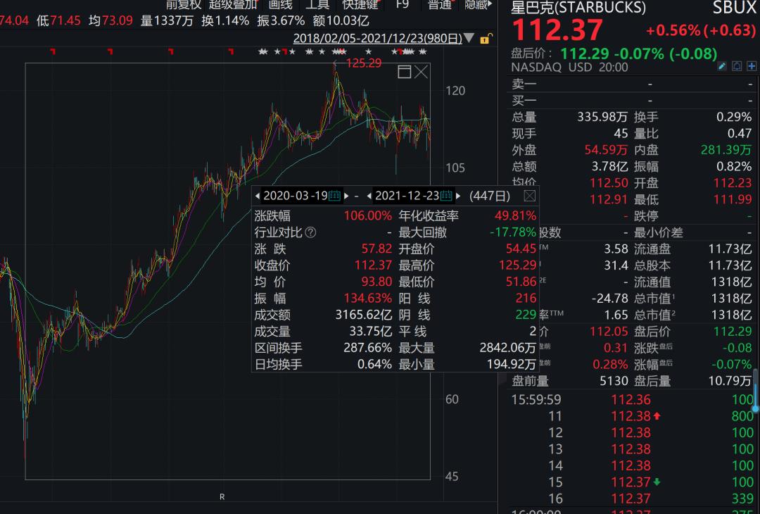 自疫情以来,星巴克是美股的大牛股,股价自2020年3月19日至今已经翻倍,市值达到1318亿美元(近8400亿元人民币)。