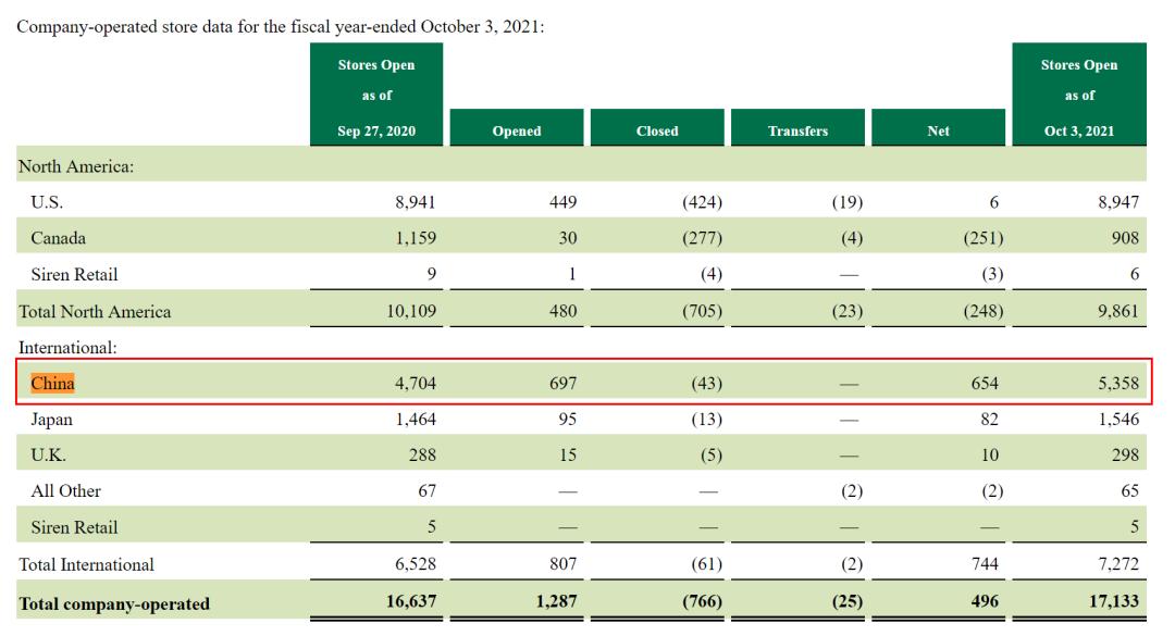 截至10月3日,中国市场共有门店5358家,相较于1年前激增654家,是星巴克门店增长最快的市场。