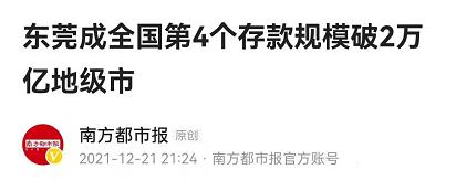 三是金融存款再上台阶,据南方都市报报道,截至11月末,东莞的本外币存款余额突破2万亿元大关,达到20004亿元,成为第4个存款规模破2万亿地级市。(前三个是苏州、无锡、佛山)