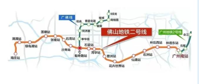地铁方面,佛山地铁2号线一期预计今年底开通,该项目起于南庄,止于广州南站,是佛山市域东西向的一条骨干线,串联起佛山的禅城区、南海区、顺德区、广州番禺区,见下图: