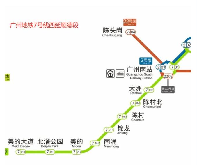 此外,广州地铁7号线西延顺德段,项目南起美的大道站,经北滘新城、陈村新城,至广州南站与广州地铁7号线一期工程连通,预计年底进入全面测试,又是一条广佛跨城地铁,见下图: