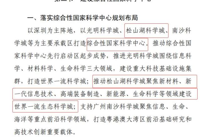 以深圳为主阵地,以光明科学城、松山湖科学城、南沙科学城等为主要承载区打造综合性国家科学中心。