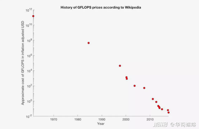 从1960年至今,1GFLOPS(每秒10亿次运算)的成本,从187亿美元降至3美分,平均每5年下降一个数量级。