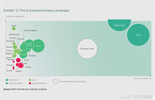根据波士顿咨询公司(BCG)发布的全球AI竞争力矩阵,中美两国领衔世界,欧盟则位居其后。
