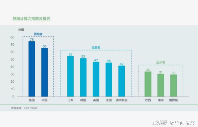 根据IDC对2020年全球各国算力的评估,中国以66分排在全球第二,仅次于美国。