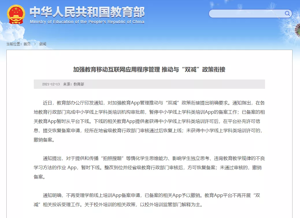 对于“拍照搜题”类APP的监管并非首次,要求这类作业APP暂时下线,这是执行“双减”的规定。今年7月,中办、国办印发《关于进一步减轻义务教育阶段学生作业负担和校外培训负担的意见》,明确线上培训机构不得提供和传播“拍照搜题”等惰化学生思维能力、影响学生独立思考、违背教育教学规律的不良学习方法。