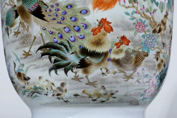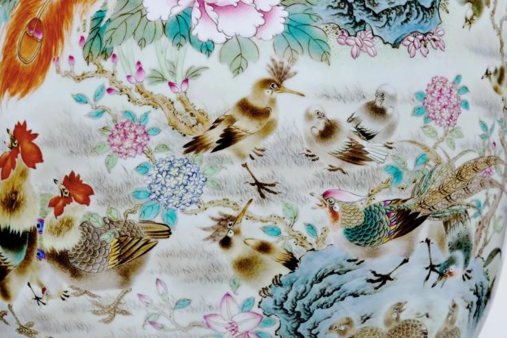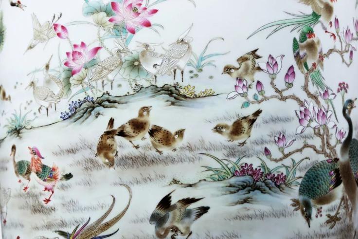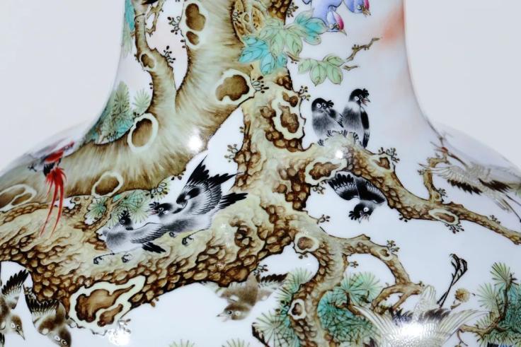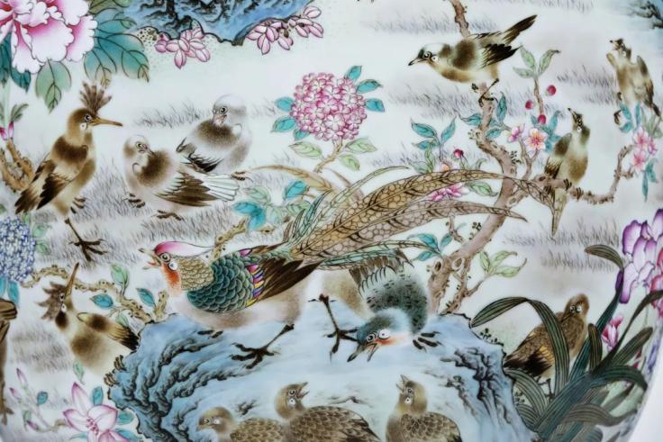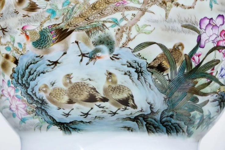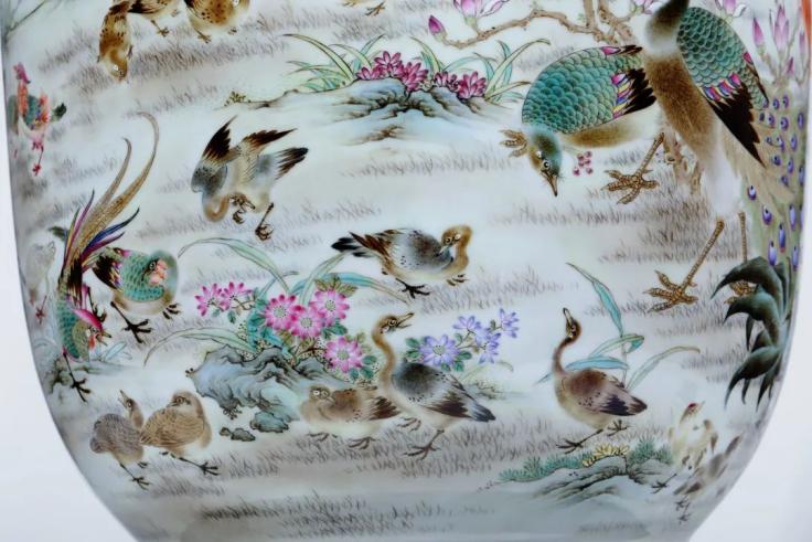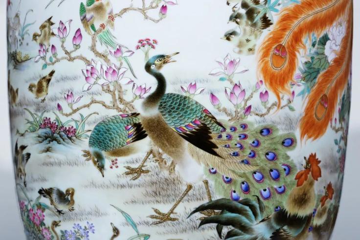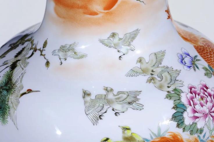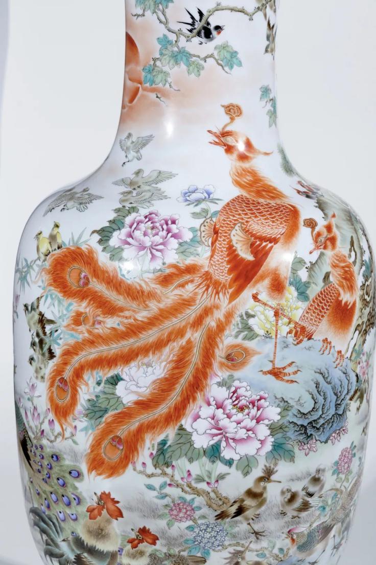 此尊【丹凤朝阳•百鸟齐鸣宝尊】画面精细丰富、体型高大恢弘,无论从画面绘制、还是烧造技术方面,都可称当代工艺技法极高水准之代表: