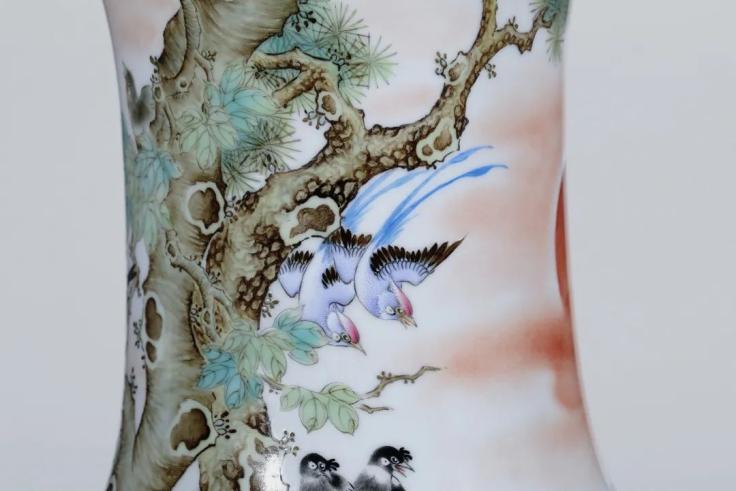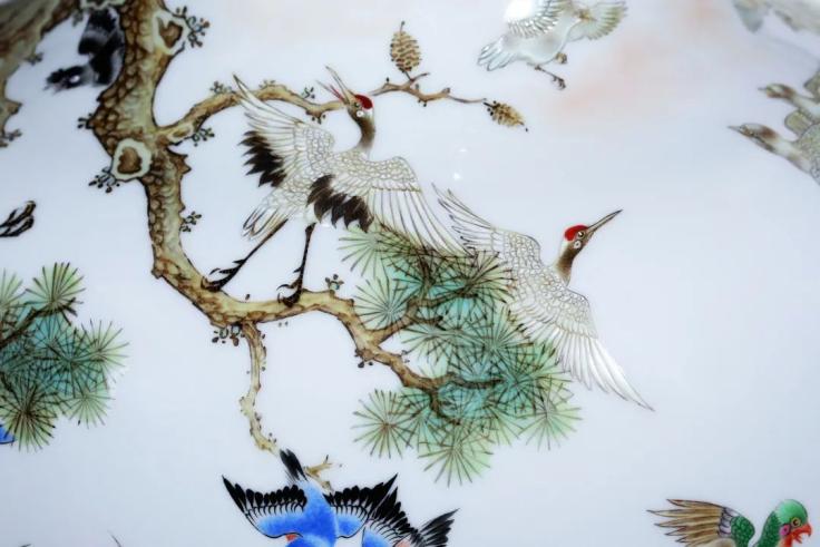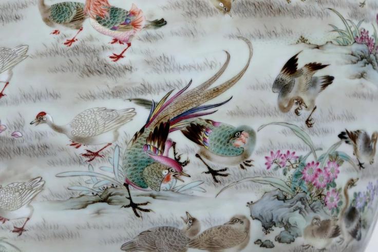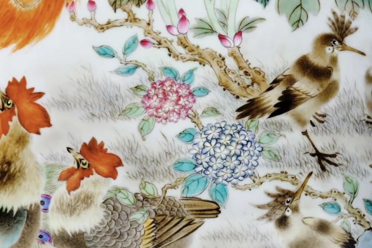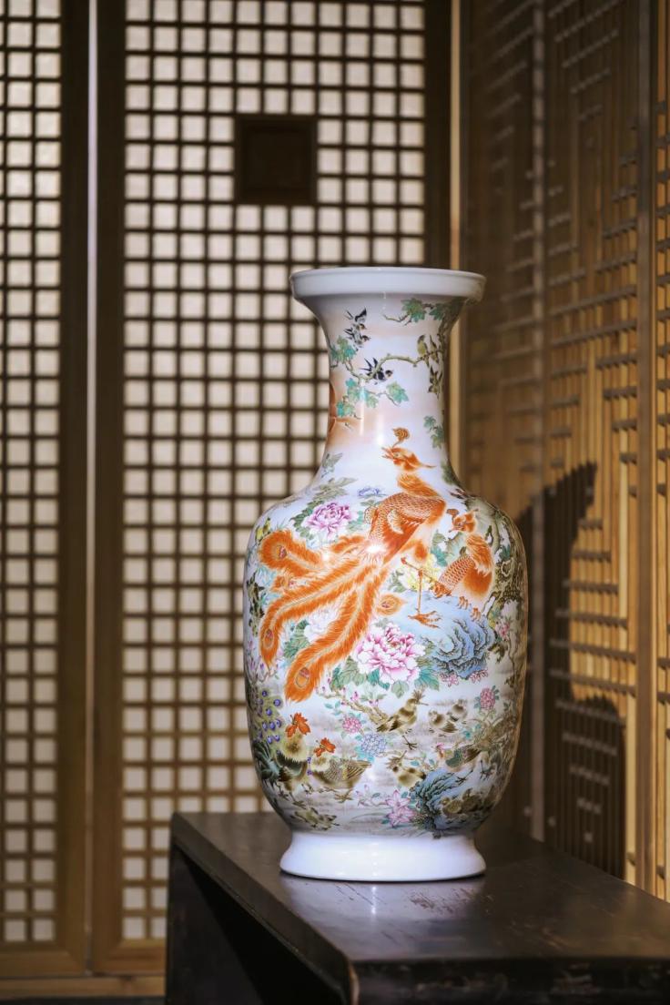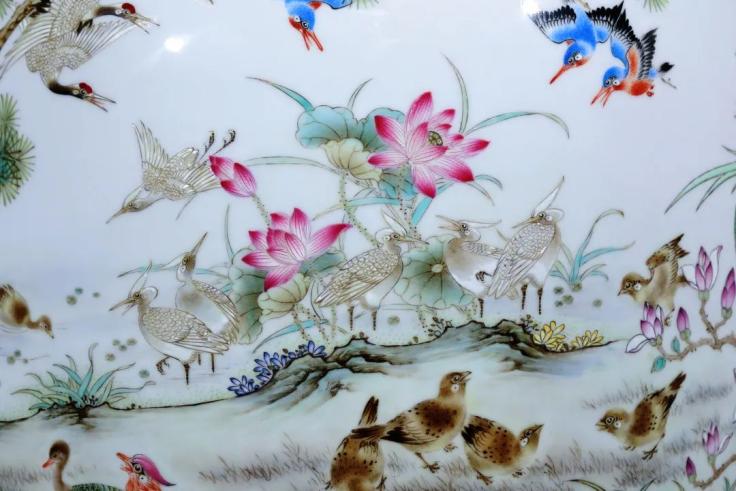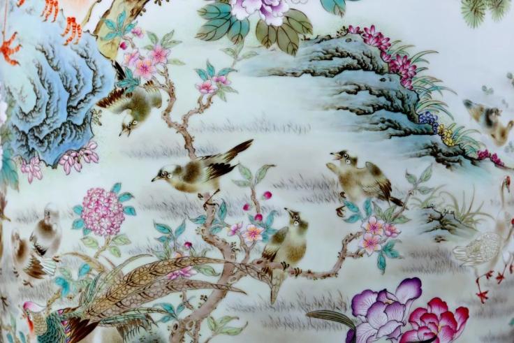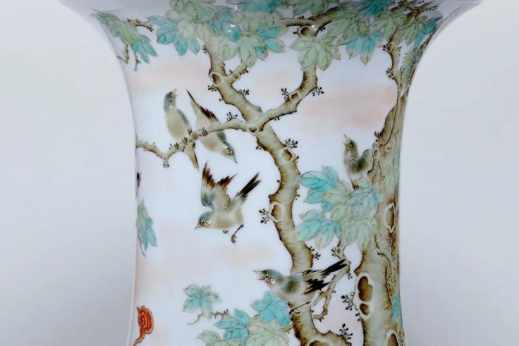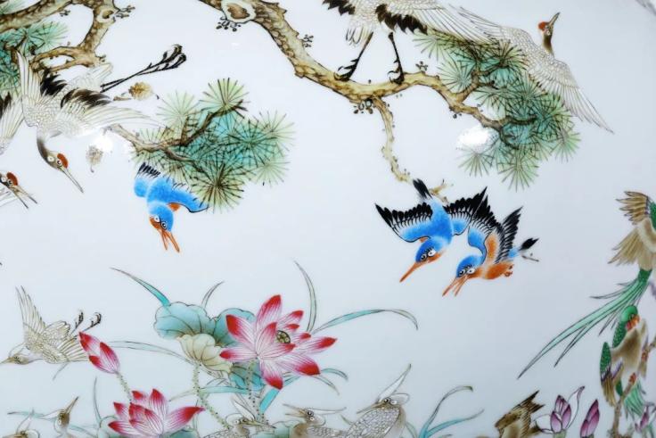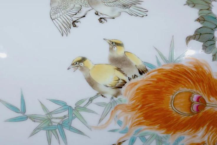 此尊【丹凤朝阳•百鸟齐鸣宝尊】画面精细丰富、体型高大恢弘,无论从画面绘制、还是烧造技术方面,都可称当代工艺技法极高水准之代表: