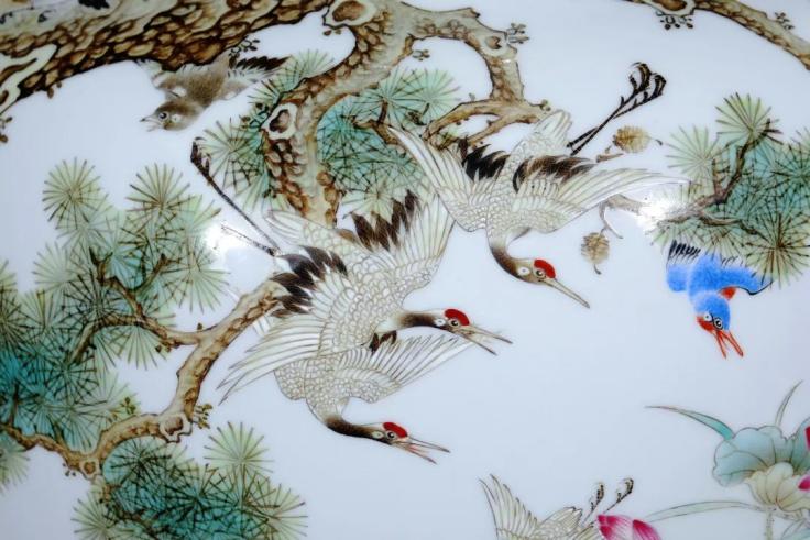 以粉彩精工技法,依白胎为纸,以仙鹤翔空设色构图。绘劲松遒枝,因松树终年常绿,经年不凋,为百木之长,与丹顶的翔鹤共寓永寿长青,以寄松鹤遐龄,灵寿明心之吉祥意涵。